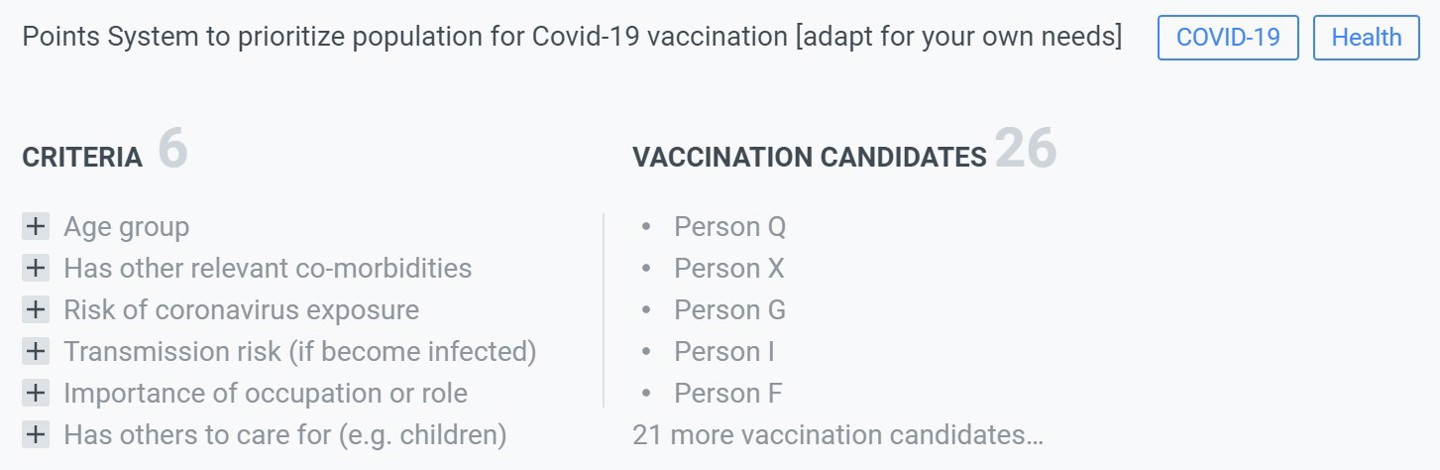 1000minds has built a tool to help prioritize people based on a variety of criteria related to need and risk. The criteria can be easily adapted to suit your own country (or organization). The tool can be viewed here, along with other tools to help with other Covid-19-related decision problems.