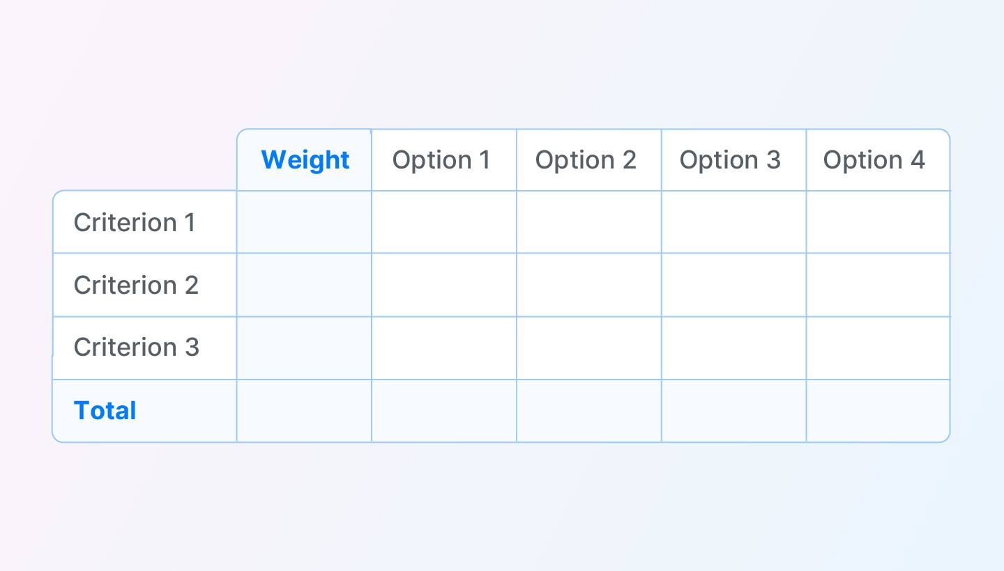 A decision matrix, or weighted scoring model, is among the more complex decision-making tools, ideal for businesses, governments, and organizations facing complicated decisions that involve multiple variables. A decision matrix involves prioritizing a list of options based on a set of criteria. Each criterion is assigned a weight, and each option is scored against these criteria. The weighted scores are then summed to determine the best option.
