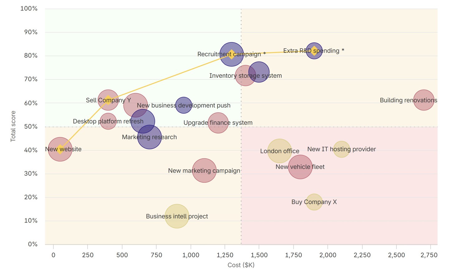 1000minds supports cost-benefit analysis and pareto analysis in the form of a value-for-money chart, as below, allowing decision-makers to weigh different considerations against the decision criteria by using different axes, bubble sizes, and bubble colors to represent different variables. The orange line represents the “pareto frontier”, showing which options are unambiguously better than all the others.