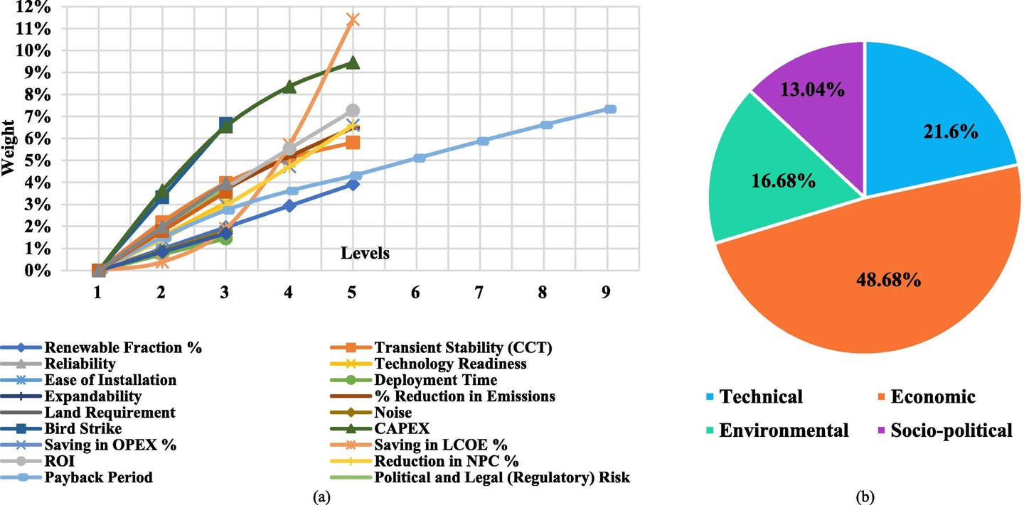 As summarized in Figure 3 from the article, the most important criterion for evaluating the hybrid energy configurations was found to be the economic criterion, followed by the technical and then environmental criteria, with weights of 49%, 22% and 17% respectively. Least important was the socio-political criterion (13%).
