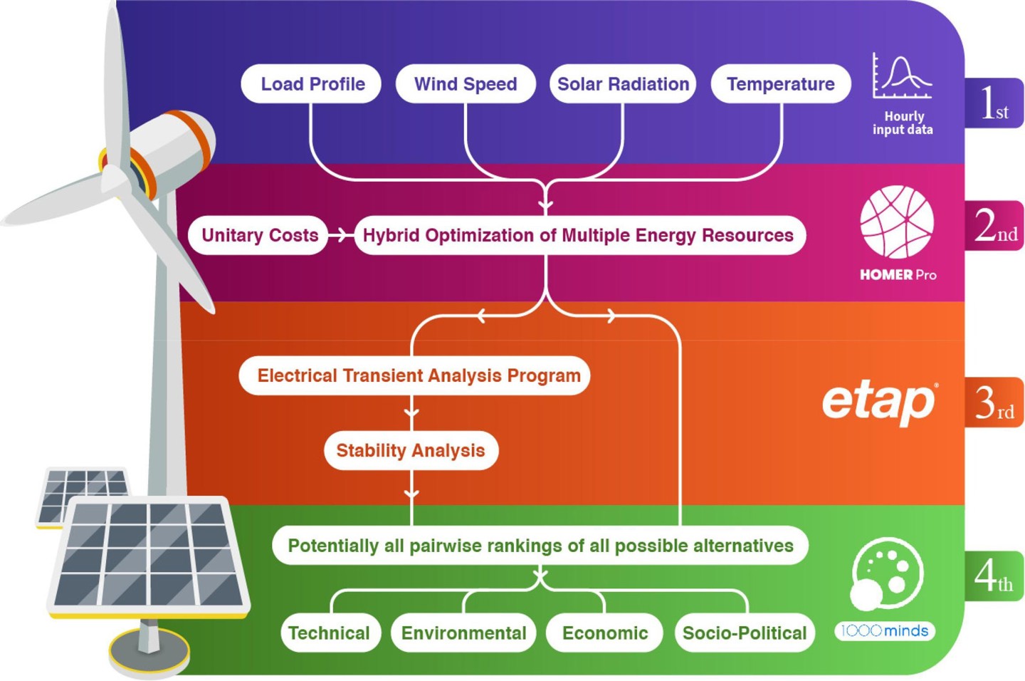 The research team used the Hybrid Optimization of Multiple Energy Resources (HOMER) and the Electrical Transient Analysis Program (ETAP) to model five possible hybrid energy configurations based on wind, solar and gas.
