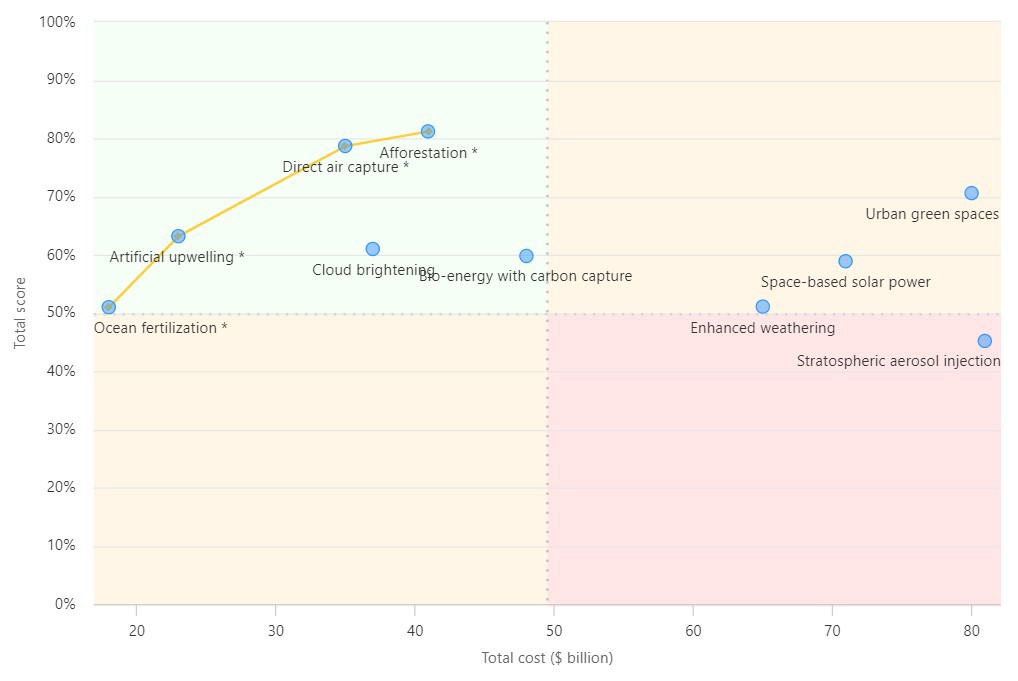 In the chart, the alternatives (i.e. geo-engineering mitigations) in the top-left quadrant represent the best value-for-money, or biggest “bang for buck”.