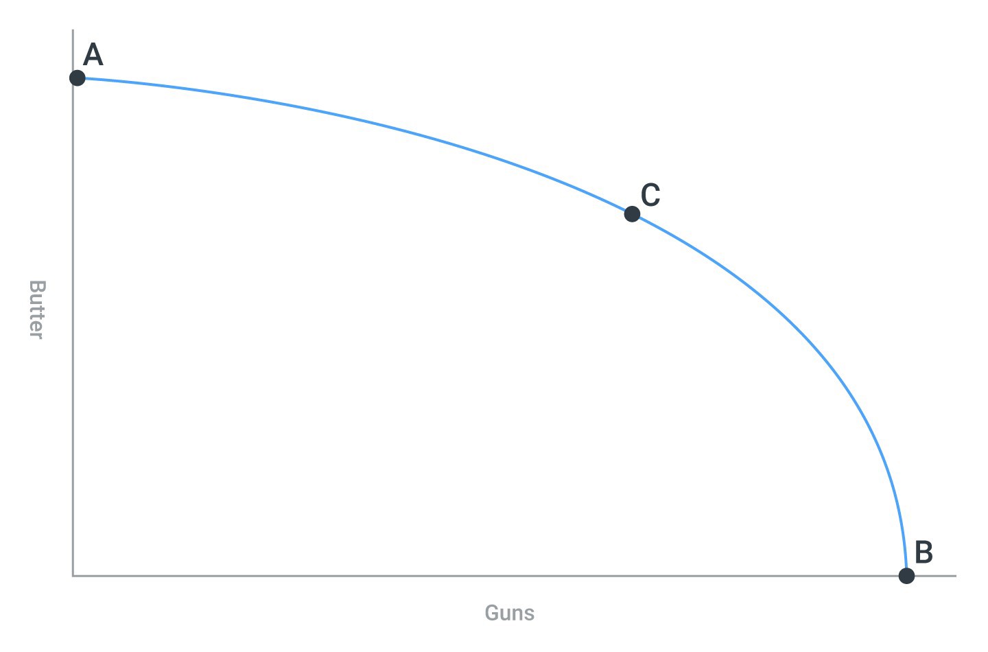 Likewise, in the example of guns vs butter above, the opportunity cost of more “guns” (military spending) is less “butter” (civilian goods), and vice versa.